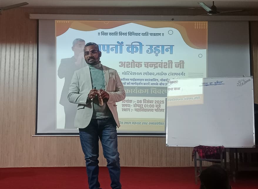 आशु चंद्रवंशी,कवर्धा। शासकीय लाल चक्रधर शाह स्नातकोत्तर महाविद्यालय अंबागढ़ चौकी में सोमवार को छात्रों के उज्ज्वल भविष्य को दिशा देने के उद्देश्य से एक महत्वपूर्ण करियर गाइडेंस, काउंसलिंग और कौशल विकास कार्यशाला का आयोजन किया गया। इस सत्र में मुख्य वक्ता के रूप में पहुंचे श्री अशोक चन्द्रवंशी ने बड़ी संख्या में उपस्थित छात्र-छात्राओं को नौकरी, प्रतियोगी परीक्षाओं की तैयारी और कौशल विकास जैसे विषयों पर विस्तृत मार्गदर्शन प्रदान किया।