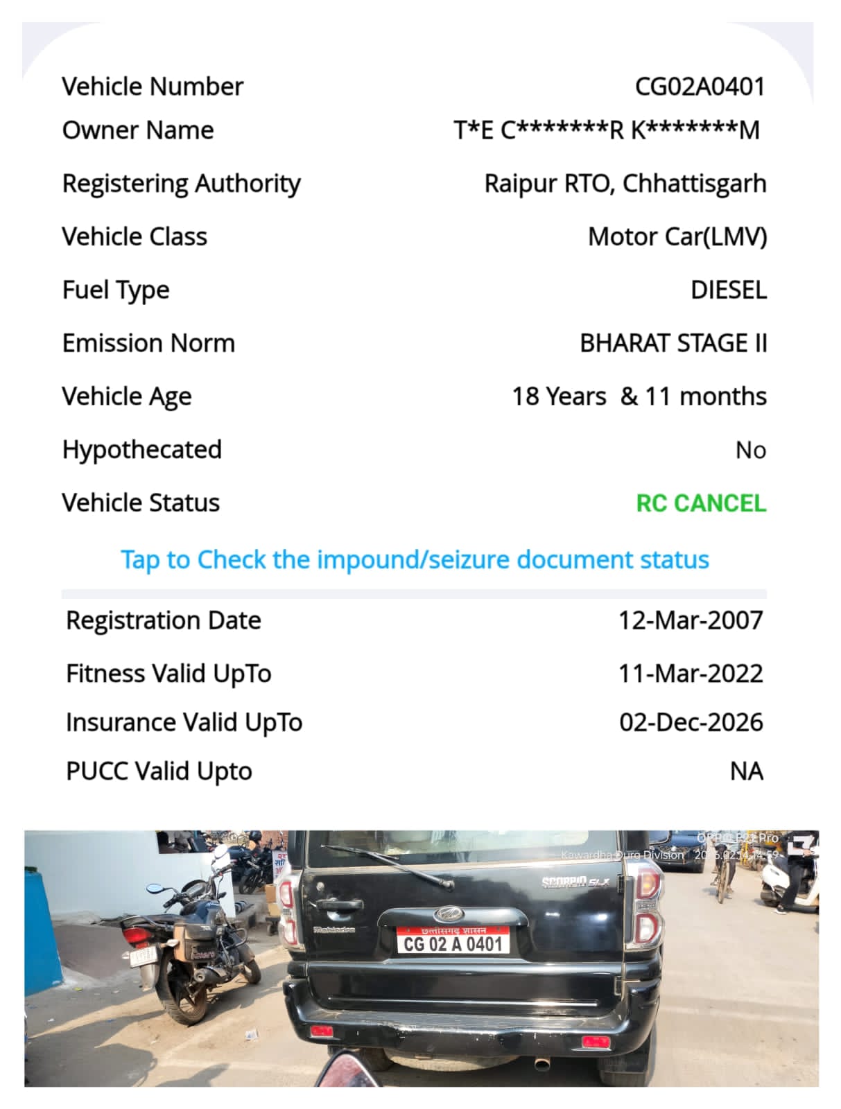 कवर्धा। छत्तीसगढ़ के कवर्धा जिले में कानून की दोहरी कार्यप्रणाली का एक बड़ा मामला सामने आया है। यहाँ भोरमदेव शक्कर कारखाना के अधीन संचालित एक शासकीय वाहन खुलेआम मोटर वाहन अधिनियम की धज्जियां उड़ा रहा है। हैरानी की बात यह है कि इस वाहन का पंजीयन प्रमाणपत्र (RC) रद्द हो चुका है, फिर भी यह बेधड़क सड़कों पर दौड़ रहा है।