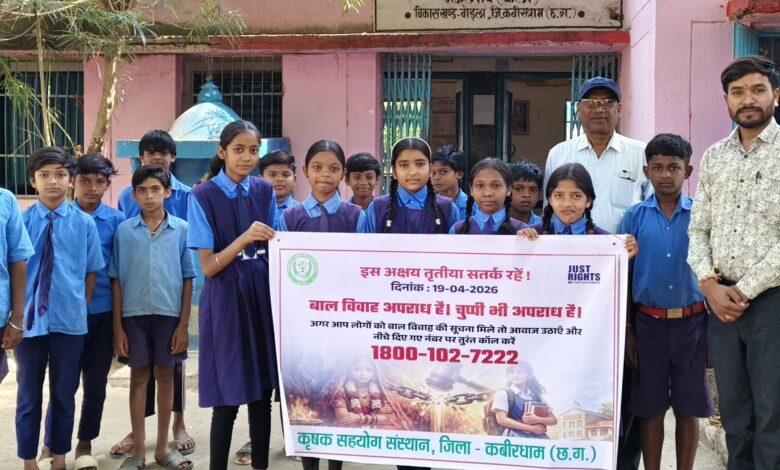 कवर्धा। जिले में बाल अधिकारों की सुरक्षा व बाल विवाहों की रोकथाम के लिए काम कर रहे संगठन कृषक सहयोग संस्थान ने अक्षय तृतीया के अवसर पर बाल विवाहों की रोकथाम के लिए सतर्कता दिवस मनाया। विभिन्न संवेदनशील गांव में जाकर अक्षय तृतीया पर बाल विवाहों की रोकथाम के लिए जागरूकता अभियान चला रहे हैं। इसमें बाल विवाह निषेध अधिकारी,आंगनबाड़ी कार्यकर्ताओं,शिक्षकों,पंचायत सदस्यों,आशा यूनिटों ने भी सहयोग दिया और जिले में बाल विवाह की रोकथाम का संकल्प दोहराया। कृषक सहयोग संस्थान जिला प्रशासन, पंचायतों, स्कूलों और धर्मगुरुओं के साथ मिलकर जिले को बाल विवाह मुक्त बनाने के लिए स्कूलों, पंचायतों और गांवों में बाल विवाह के खिलाफ जागरूकता अभियान चला रहा है और जिले में हजारों लोगों को बाल विवाह के खिलाफ शपथ दिलाई है। संगठन खास तौर से बाल विवाह के लिहाज से संवेदनशील अक्षय तृतीया जैसे मौकों पर प्रशासन व सरकार के सहयोग से इसकी रोकथाम के लिए विशेष अभियान चलाता रहा है। कृषक सहयोग संस्थान देश में बाल अधिकारों की सुरक्षा व संरक्षण के लिए 250 से भी अधिक नागरिक समाज संगठनों के देश के सबसे बड़े नेटवर्क जस्ट राइट्स फॉर चिल्ड्रेन का सहयोगी संगठन है।